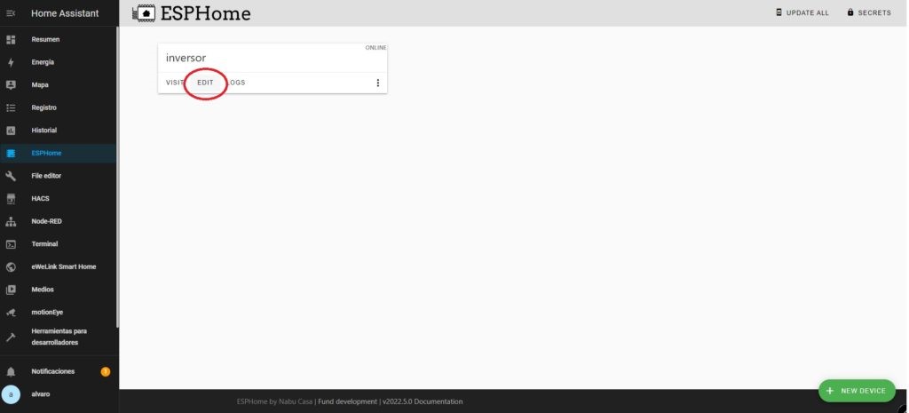 Para ESPHome, os dejo el texto que tenéis que pegar y modificar en vuestro NOMBREESP.yaml, en mi caso, inversor.yaml