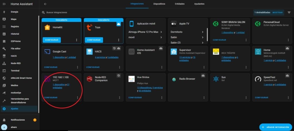 Una vez realizado todo, tendremos que ir a Ajustes–> integraciones –> mqtt