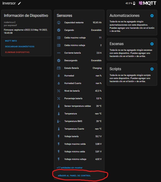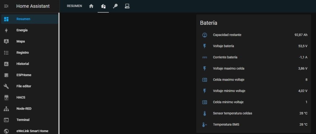 una vez dentro nos aparecerá toda la información que recibimos del BMS y podremos añadirla a nuestro Lovelace.