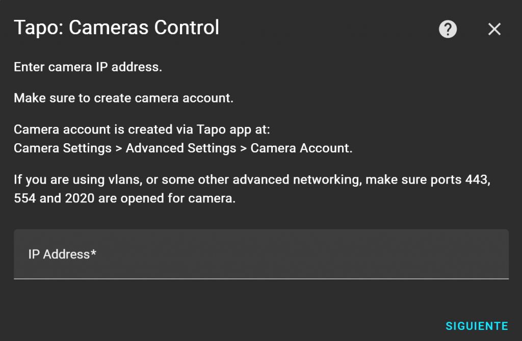 Se nos abrirá una pantalla de configuración en la que tendremos que añadir la dirección IP de la cámara, que previamente hemos averiguado a través del router.