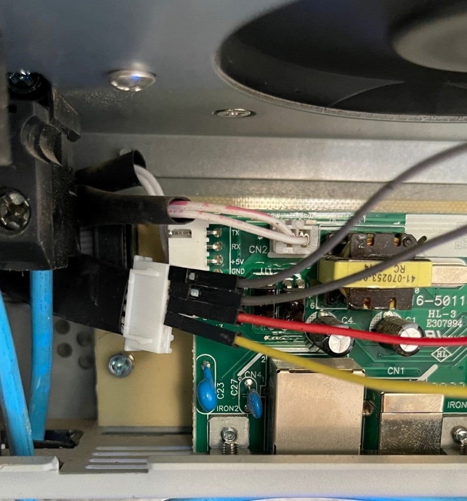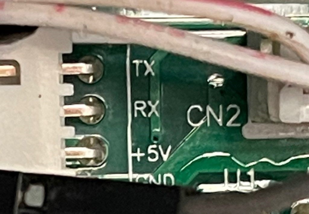 lo principal son las conexiones entre el inversor y la placa de desarrollo. conectaremos los cables machos al puerto uart del inversor, que encontramos en la parte inferior, en mi caso un conector blanco.