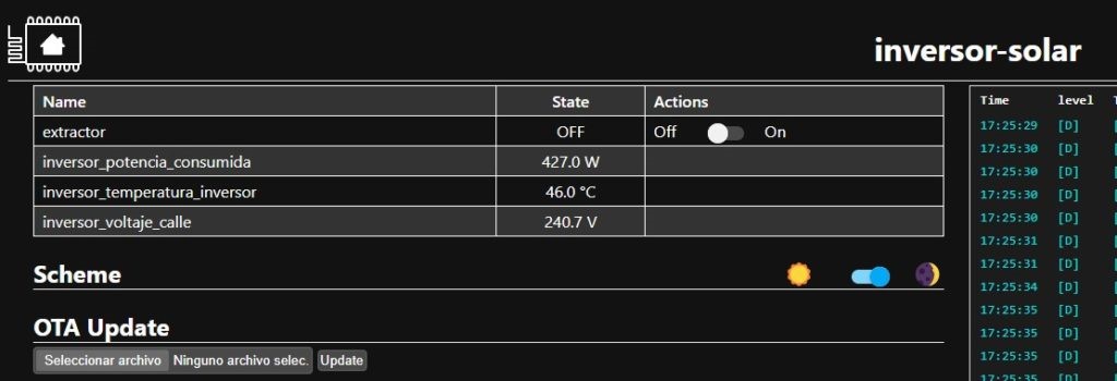 Una vez todo montado, desde la aplicación de ESPHome, pulsamos en «visit» en nuestro NodeMCU llamado «inversor solar» y nos llevará al web server donde tendremos lo siguiente, menos la primera opción que se lo añadí yo para hacer funcionar un extractor.