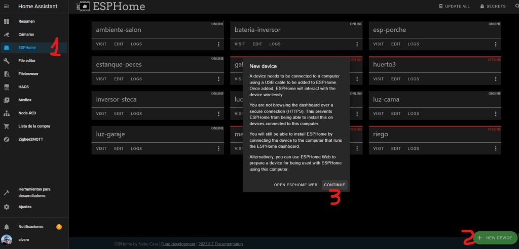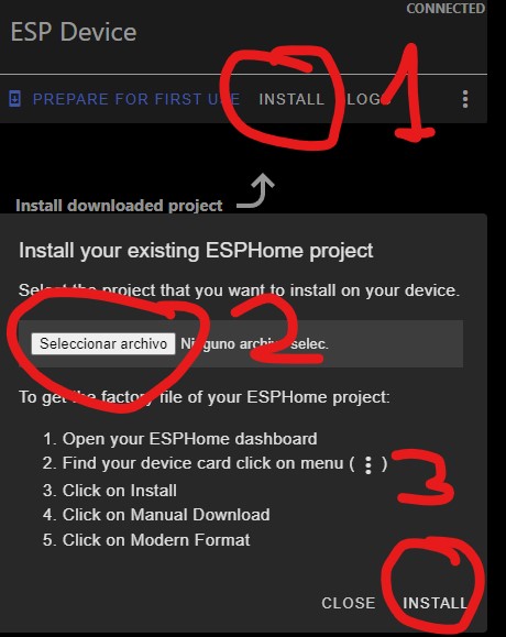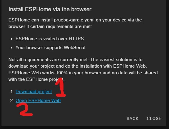 Una vez que se haya creado el fichero, lo descargamos y abrimos el link del punto 2 de la imagen, para ir al ESPHome Web y cargar nuestro firmware.