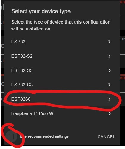 Seleccionamos nuestro dispositivo, en este caso vamos a ESP8266 y tenemos dos opciones, usar recomendado o elegir el especifico, lo cual vamos a ver.