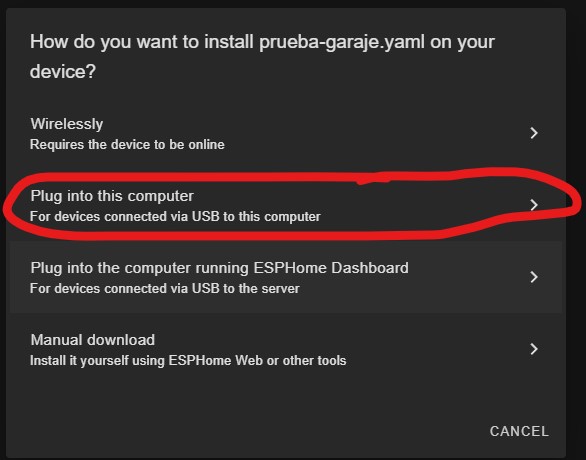 Una vez dentro, copiaremos y modificaremos el código de arriba, con nuestra red wifi y la contraseña OTA, si tenemos, y pulsamos en Install y luego en «Plug into this computer», ya que lo tenemos conectado al equipo en el que estamos haciendo todo.