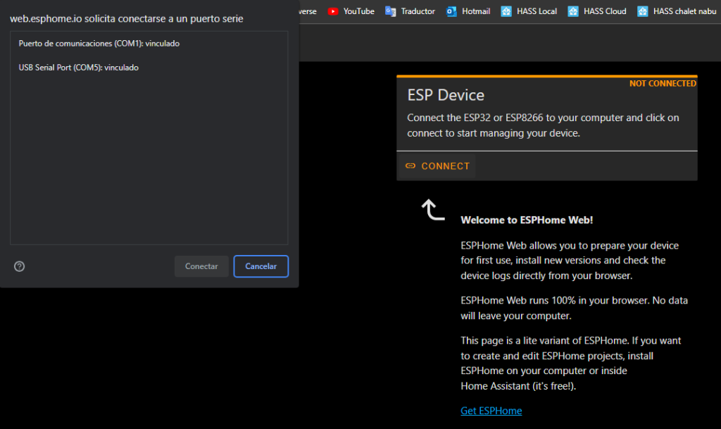 Una vez dentro de la web, pulsaremos en connect y elegimos el puerto COM que nos haya asignado el equipo (si no sabes como averiguarlo, os dejo el siguiente enlace. LINK)